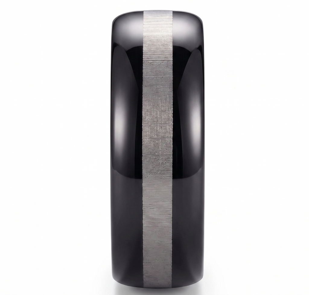 The ring features a brilliant, high-polish black finish that dramatically frames a textured, brushed silver-tone center stripe. This eye-catching two-tone contrast makes it a versatile accessory that pairs effortlessly with a casual pair of jeans or a tailored formal suit.